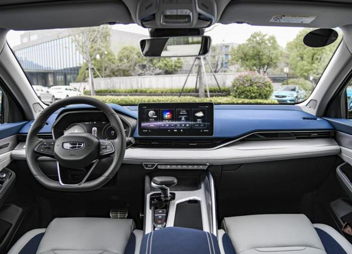 内饰方面,新车采用了全新的“时空交叠座舱”造型设计,整体线条十分流动、简洁,视觉效果时尚、科技。具体来看,新车使用了游艇蓝与高级灰配色,搭配平底三辐式多功能方向盘、12.3英寸液晶仪表、悬浮式12.3英寸中控大屏,质感突出。科技配置上看,整车除支持OTA云端升级外,还搭载了App远程控制系统、GKUI吉客智能生态系统、手机智能蓝牙钥匙、语音智能交互助手等配置,科技感极强。